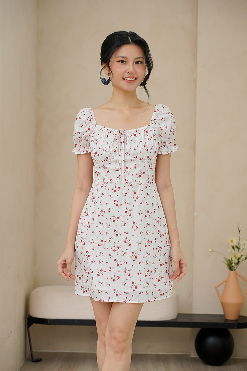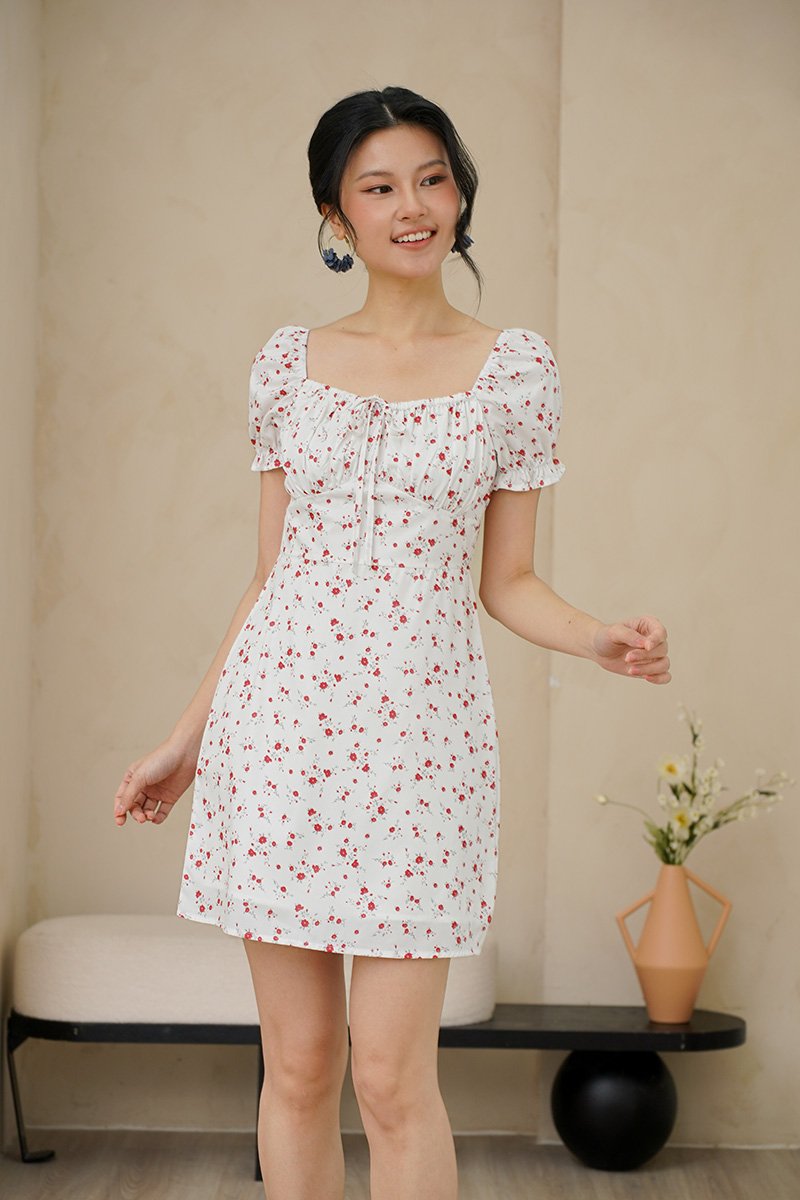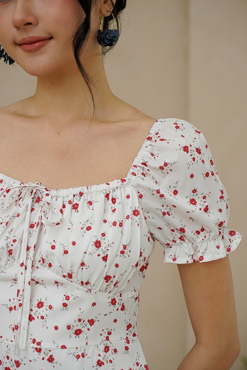 Spotlighting a penchant for the milkmaid prairie style, this shirred tie bust ditsy floral dress is decorated with a garden of whimsical poppy florals and is an utterly romantic piece. The shirred tie bust detail ensures that your shape stays in place and is not lost in the pretty florals composition. It also makes for a very flattering bustline and decolletage. Lovestruck – anyone who lays eyes on this pretty summer dress would become just so. Even if not for CNY, it is also so perfect for Valentine’s Day or beyond. This summery mini dress can be worn on or off the shoulders and is adorned in an awestruckingly pretty floral print on a romantic white or navy base. It has a softly elasticated shirring bodice and a loose hanging skirt to keep its silhouette a little loose and relaxed. Master feminine daytime dressing in this. We love this styled with low heels, sun-kissed skin and salt-tousled waves. Fully lined, not sheer. Elasticised neckline and sleeves. Tie string at bust. Concealed back zip closure. Made of smooth cotton viscose. Comes in navy blue and red. Available in sizes S, M & L.
