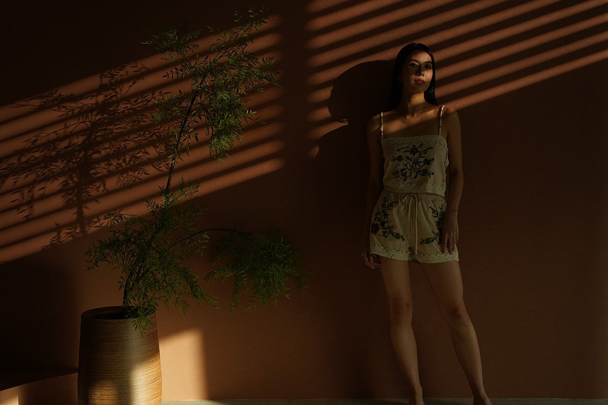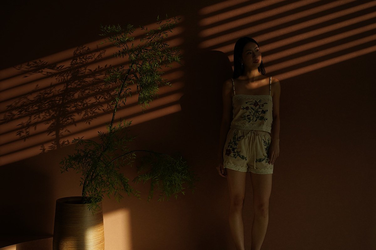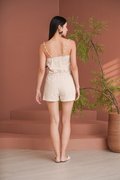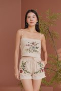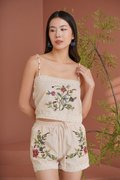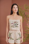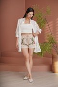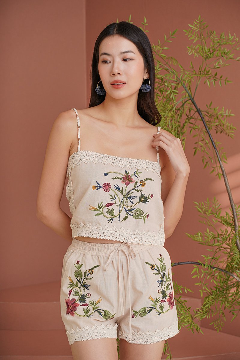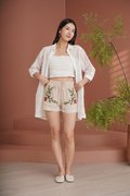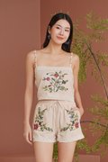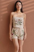 Elegant and timeless, lace sublimates silhouettes with finesse and refinement. An embroidered 'Eastern Rose' illustration masterfully rendered in dimensional broderie embellishes this shorts suit set tailored from linen crepe. Subtle scalloped edges and a refined finish add to its romantic charm. The camisole and shorts set is a stunning blend of elegance and femininity, designed to elevate your wardrobe with its intricate details. Featuring vintage floral embroidery lace, this top exudes sophistication while maintaining a lightweight and airy feel. The flattering lace lattices accentuates the waist, creating a graceful and timeless shape. The embroidered flowers create an elegant, vintage-inspired look that pairs beautifully with dresses or jeans, but we recommend matching the set together. Upgrade your spring summer wardrobe with this coord that combines comfort and sophistication, made from breathable linen and adorned with exquisite cross-stitch embroidery. The oatmeal base highlights the intricate designs of tropical foliage, creating a harmonious blend of nature and style. Designed with an artisanal touch and scalloped trims, the shorts bring a touch of understated luxury to any daytime look. Paisley appliques complement the scalloped guipure lace underneath. A refined, bohemian aesthetic serves as inspiration for the palette, the flattering elastic waistline of the design is completed by a tonal tie for a flawless fit, while the rest of the shorts is embroidered with pastel florals, and gives off a beautiful mirrored look. Comes with side pockets on shorts. Elasticised band on shorts with tie front styling. Pull on styling. Made of polyester blend crepe linen cotton. One colour only. Available in sizes XS, S, M & L.