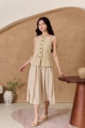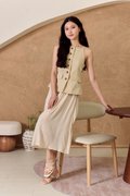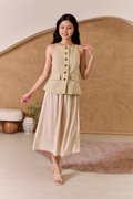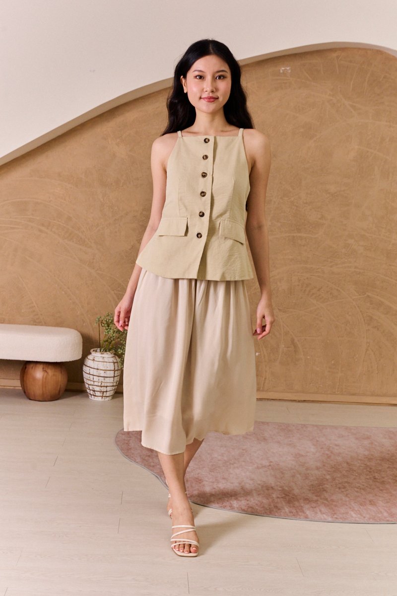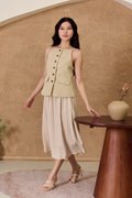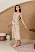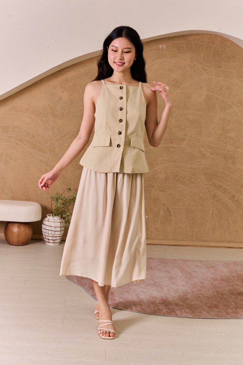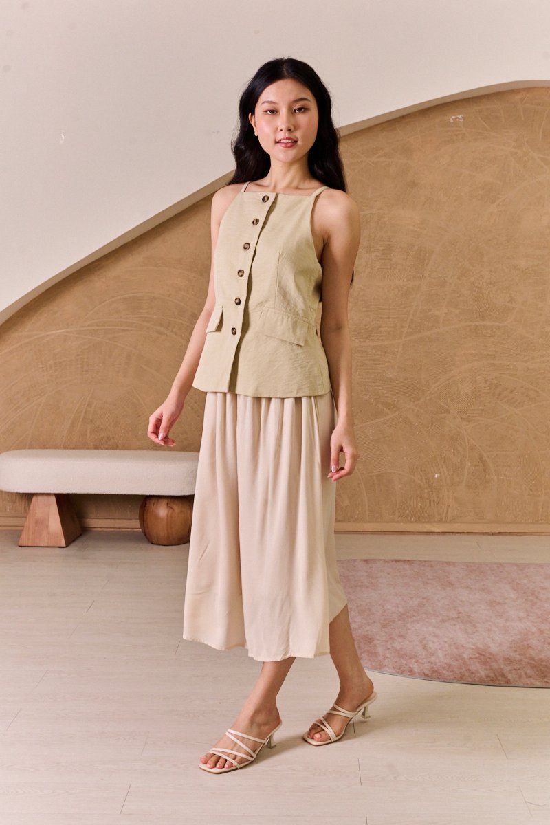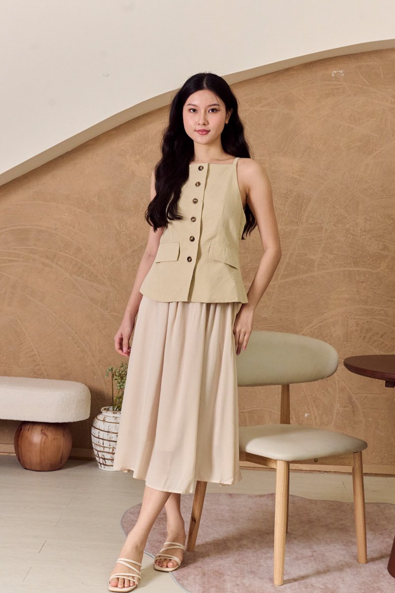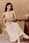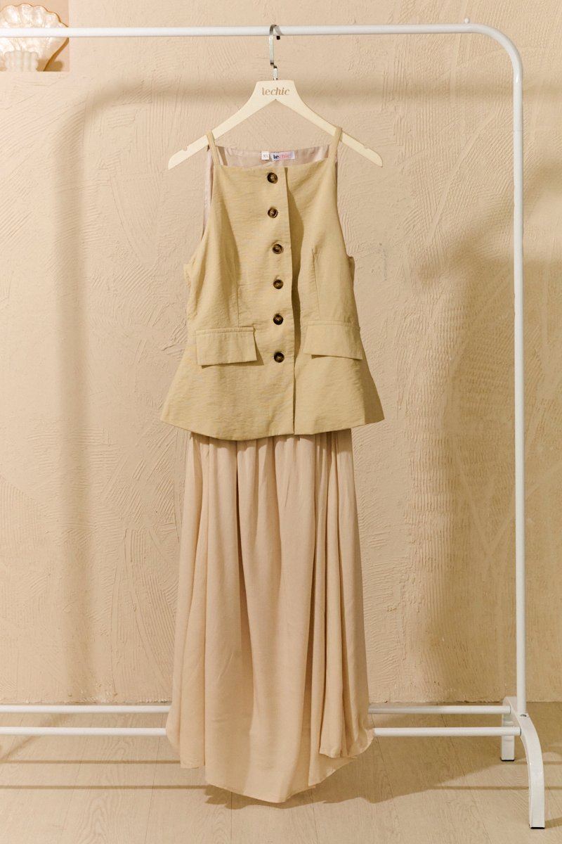 This is a full piece attached dress. Structured waistcoat top blends clean lines with a soft, summer-ready feel. Its linen-blend fabric adds an airy touch to this tailored piece. Designed with a minimalist pattern, this modest-length skirt with loose pleats exudes timeless style. The partially elasticated waistband ensures a snug fit and easy wear. The piece is shaped with a square neckline that artfully juxtaposes the contours and darts across the bodice, while a linen fabrication and cotton lining ensure breathability on warm days. Bring some pastel tailoring into your summer look in an extended silhouette. This dress moves with a grace that mirrors the soft lapping of waves, creating fluidity as you walk. The skirt drapes elegantly, adapting to each stride. The silhouette holds its charm whether layered with a gauzy shawl or left to dance in the breeze on its own. Toss your essentials into a woven crossbody and you're ready to transition from morning lattes to sunset strolls. The lightweight, non-stretch weave brings a sense of ease and breeziness, with the loose pleats adding a crisp, relaxed flair. The combined look of a structured waistcoat with airy skirt balance allure with relaxed sophistication, while the button placket introduces a refined touch amidst the free-spirited vibe. Functional buttons. Decorative pockets. Fully lined, not sheer. Skirt is attached to waistcoat, sewn together in the interior. This is a full piece dress. Button front styling on waistcoat, elasticised waistline for inner skirt. Made of structured twill blend (top) and cotton poly blend (bottom). One colour only. Available in sizes XS, S, M & L.