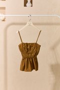 Reimagine pared-back silhouettes through ruching techniques. This top is crafted from lightweight cotton and features a gathered bodice, slender straps and an open V-back with tie detailing. The cami is a sweet little thing with serious main character energy. Think sun-warmed cotton, romantic ruching, and a silhouette that twirls somewhere between “cottagecore cutie” and “just got back from Provence.” There’s something about that ruched bodice, it hugs gently without clinging, like a soft secret you’re not quite ready to share. The scrunched details? Totally intentional. Totally flattering. Totally wearable for that third espresso run or your second date (or both, no judgment). Then the hem flares out with this dreamy peplum shape that makes everything look just... softer. Floatier. A little more la vie en rose, even if you’re just pairing it with worn-in denim and yesterday’s gold hoops. It's the kind of top you don’t overthink. It just works. Sunny days, breezy afternoons, that random invite to lunch. Effortless, flirty, and made for movement. This shirred bustier blouse easily creates a stylish layered look. Elasticised waistline and at back. Rubberized and scrunched. Tie back style. Pull on styling. Made of cotton poly blend. Comes in dark khaki and ecru. Available in sizes XS, S, M & L.