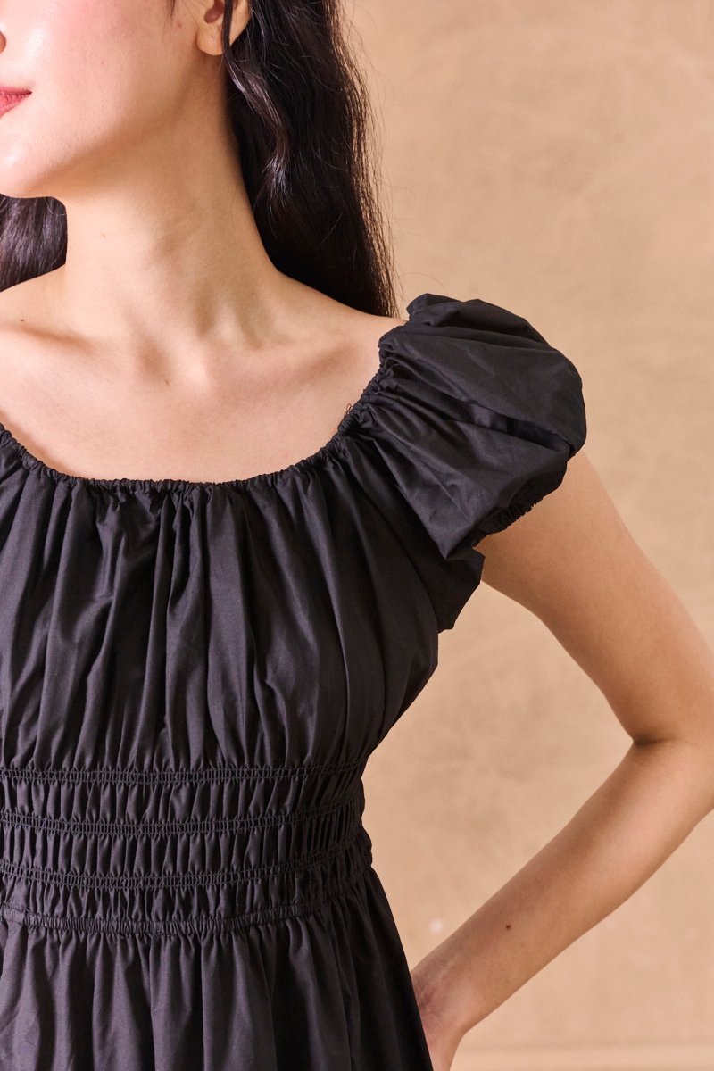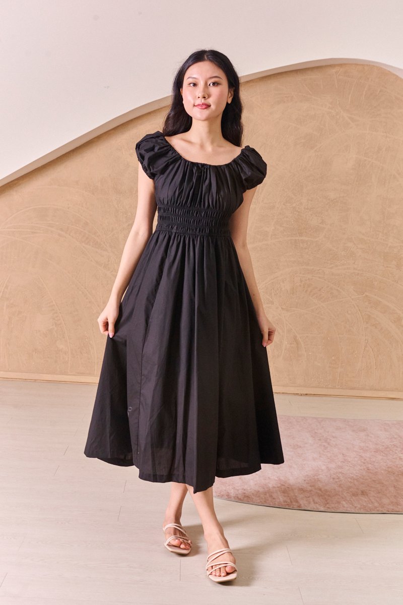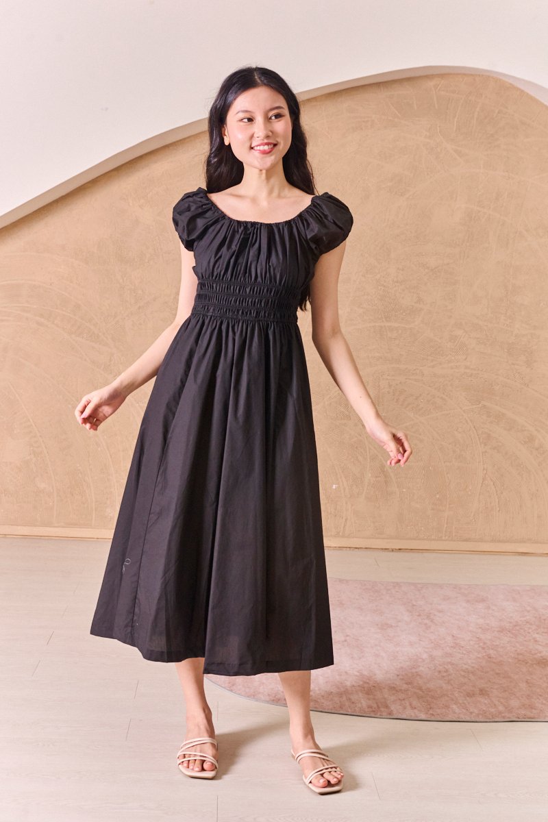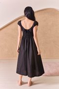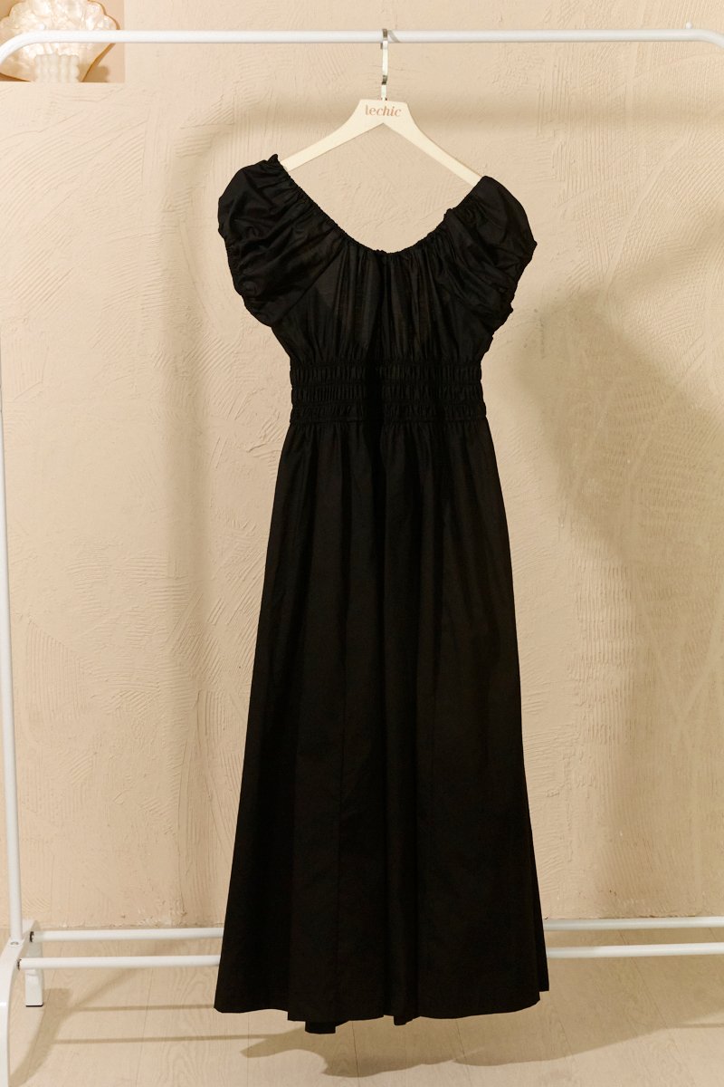 Crafted from cotton voile, this cute LBD features a smocked scoop neckline with an adjustable tie (at the back), short puffed sleeves, a gathered bust, and a fully layered bodice with elasticized smocking leading to an ankle-grazing A-line skirt. Pair it with strappy sandals and a woven tote for a perfect summer look. This prairie-like dress is cut from crisp cotton poly that's shirred through the bodice and has pretty puffed sleeves. Be it martini or mai tai, this LBD pairs so well with a drink in the hand! This effortlessly elegant dress features a flattering silhouette with a relaxed fit, stretchable sleeves, and a breezy, lightweight fabric that moves beautifully with every step. The midaxi length adds a touch of drama, while the timeless black hue keeps it classic and versatile. Breeze through sunny weekends and vacay plans in this dress rooted in the cult-favorite retro/romantic signature—think puff sleeves, intricate shirring and a dainty bow bridging the keyhole cutout at the back. Shirring at the waist defines the shape and meets an a-line shape bottom. Slips on easily overhead. Inner lining full length to hem, not sheer. Elasticised neckline and sleeves. Smocked waistline and back. Drawstring tie back style. Stretchy pull on styling. Made of cotton poly blend. One colour only. Available in sizes S, M & L.