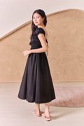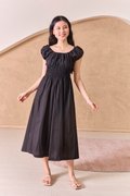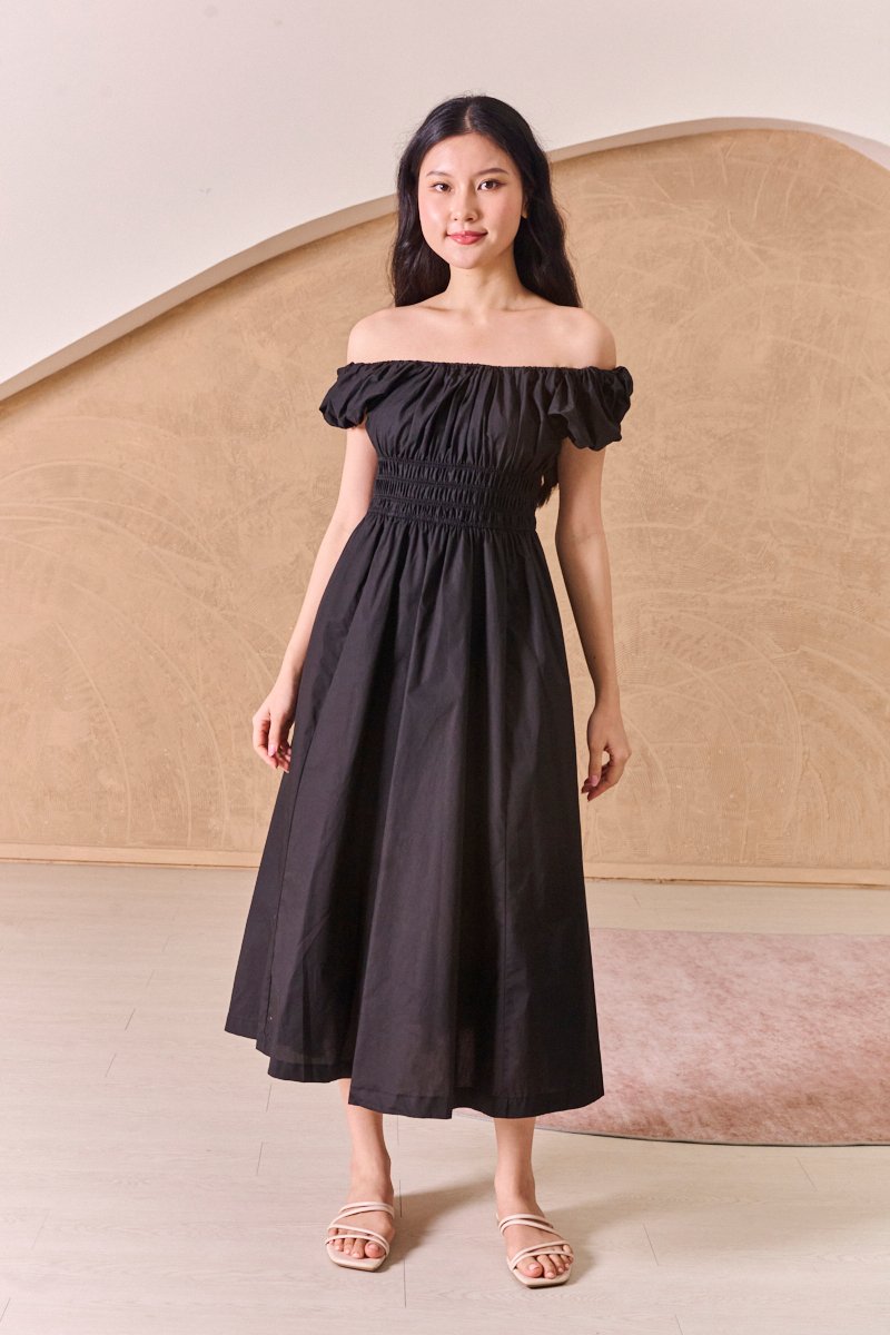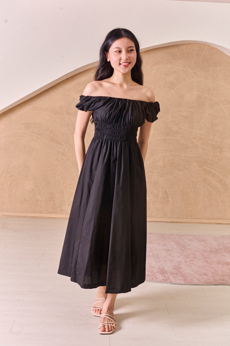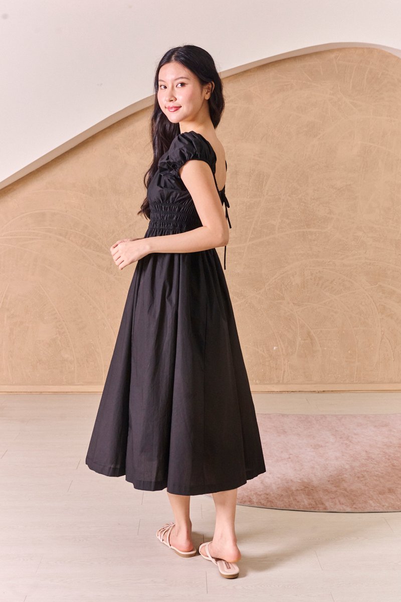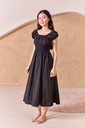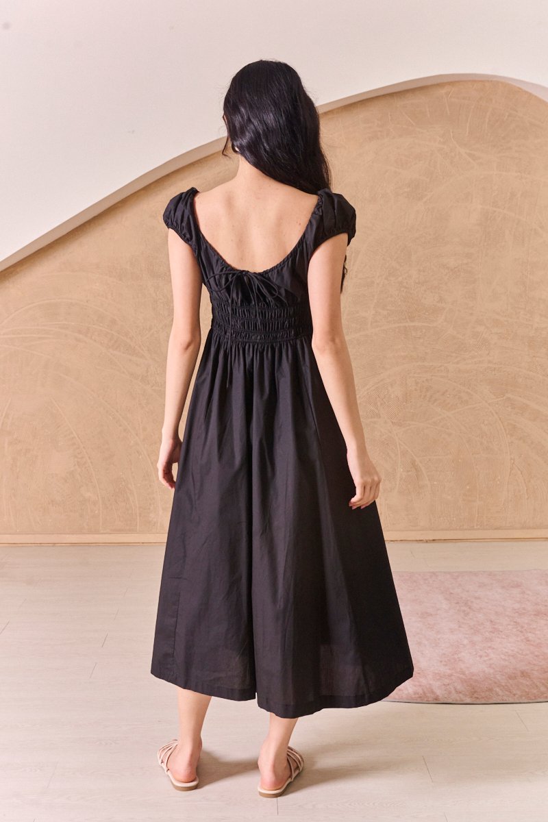 Crafted from cotton voile, this cute LBD features a smocked scoop neckline with an adjustable tie (at the back), short puffed sleeves, a gathered bust, and a fully layered bodice with elasticized smocking leading to an ankle-grazing A-line skirt. Pair it with strappy sandals and a woven tote for a perfect summer look. This prairie-like dress is cut from crisp cotton poly that's shirred through the bodice and has pretty puffed sleeves. Be it martini or mai tai, this LBD pairs so well with a drink in the hand! This effortlessly elegant dress features a flattering silhouette with a relaxed fit, stretchable sleeves, and a breezy, lightweight fabric that moves beautifully with every step. The midaxi length adds a touch of drama, while the timeless black hue keeps it classic and versatile. Breeze through sunny weekends and vacay plans in this dress rooted in the cult-favorite retro/romantic signature—think puff sleeves, intricate shirring and a dainty bow bridging the keyhole cutout at the back. Shirring at the waist defines the shape and meets an a-line shape bottom. Slips on easily overhead. Inner lining full length to hem, not sheer. Elasticised neckline and sleeves. Smocked waistline and back. Drawstring tie back style. Stretchy pull on styling. Made of cotton poly blend. One colour only. Available in sizes S, M & L.