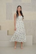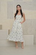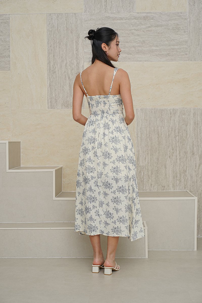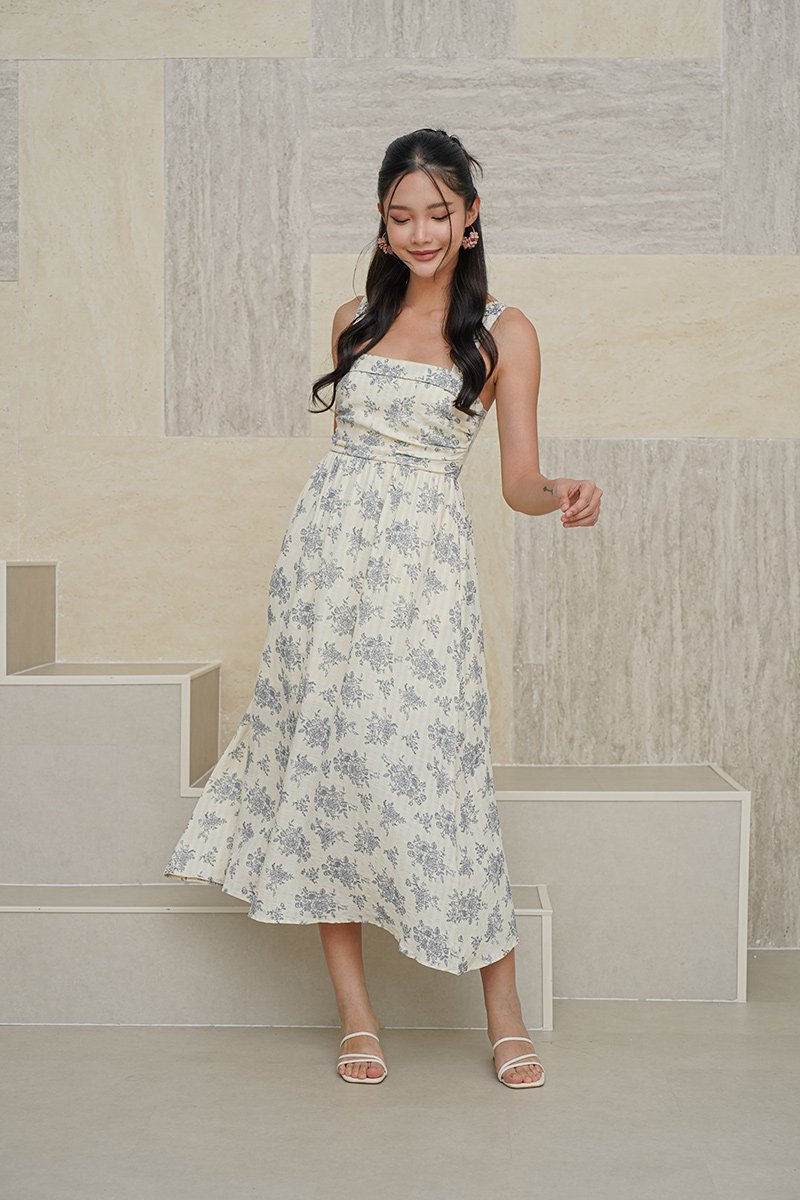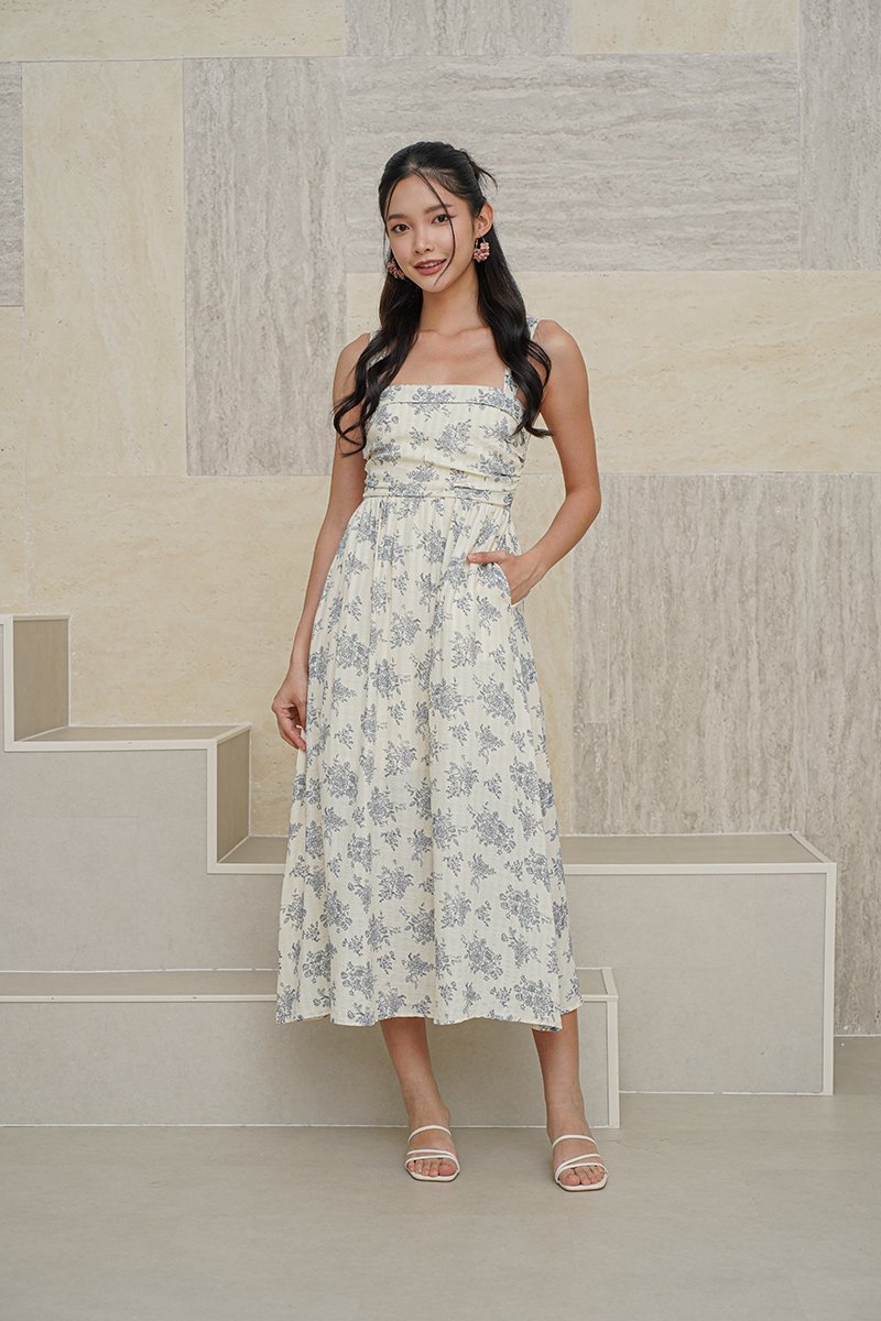 Flattering maxi dress in our textured drapey fabric, featuring ruching details along the bodice, adjustable wide straps, center-back smocking and a floaty skirt. Look closely, and you would see light tonal stripes in the background of those teacup florals, resembling a cute vintage wallpaper. Cut from crisp cotton poplin rendered in a painted floral still life motif, this midi length dress features a ruched bodice and a gathered A-line skirt silhouette. Thoughtful details throughout the garment include a playful flap neckline, engineered print placement throughout and side seam pockets. Elegant foldover bust detail adds sophisticated texture and shape. Horizontal pleating gathers the bodice of a twirly midi dress in a fit-and-flare silhouette with smocking at the back for a perfect fit. This piece is designed with a front bodice pintuck to add some layerings to the dress, best still it comes with side pockets. Elegant yet practical, wear yours with strappy stilettos to complete the look. Pleated bust detailing creates subtle texture and feminine volume. Hidden side pockets seamlessly blend practicality with style. Made of soft cotton slub with tonal stripes and porcelain florals, this dress is in a league of its own. Adjustable straps. Comes with side pockets. Smocked at back. Fully lined, not sheer. Concealed back zip closure. Made of cotton linen rayon. Comes in blue and black. Fabric has a tonal stripe pattern undertone. Available in sizes S, M & L.