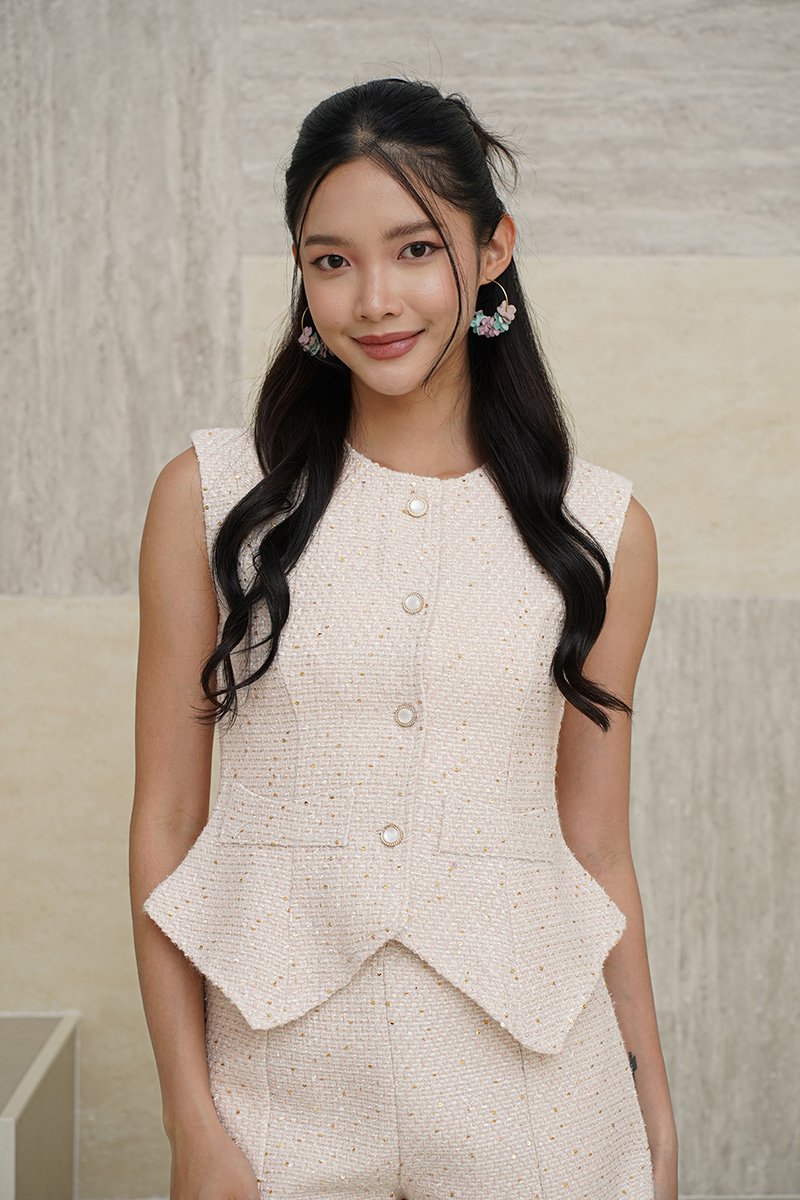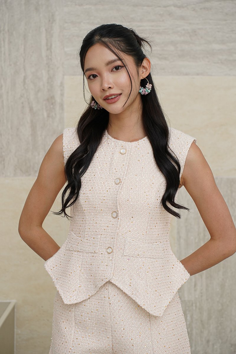 Layer up with luxe bouclé. Defined by crisp cuts, look-twice details, and playful polish. Here, there, and everywhere, this tweed co-ord makes your look. A textured tweed fabric detail with metallic tinsel thread. Elevate your layering game with our chic to the times tweed co-ord, a chic addition to any wardrobe. The longline vest features a classic round neckline and a streamlined, sleeveless silhouette, perfect for a sleek, modern look, uplifted with a sharp inverted V neckline. The pearly button-front closure adds polish, while the non-functional flap pockets on the vest bring a touch of subtle detail to the boucle texture. Fully lined for comfort and structure, it’s an ideal pairing with the matching separate for an effortlessly coordinated, sophisticated ensemble. Featuring a high-waisted fit and flattering shape, the shorts are made from textured boucle fabrication for a luxurious touch. The mini length and back zip closure create a sleek and streamlined silhouette, while the fully lined interior ensures comfort. Crafted in a luxurious boucle tweed, finished with princess panel seams that create a close-fitting, tailored shape. Stand out from the crowd with its unique split detail, making it a must-have in every fashionista's closet. Each colour brings its own individuality and vibe. You can't go wrong with black, especially if shimmering tinsel boucle, brass buttons and a sculpting shorts fit are at play. But the pared back pastel cream in birchwood and the light blush are so alluring and feminine to bring out your style. Which would be your pick? Grab a few to mix and match with. Functional buttons. Buttons are mother-of-pearl shine with brass rims. Decorative pocket welts on top. Comes with side pockets on shorts. Fully lined, not sheer. Button front styling for top, concealed back zip closure for shorts. Made of woven tweed boucle fabric. Comes in birchwood, blush and black. Available in sizes S, M & L.