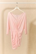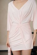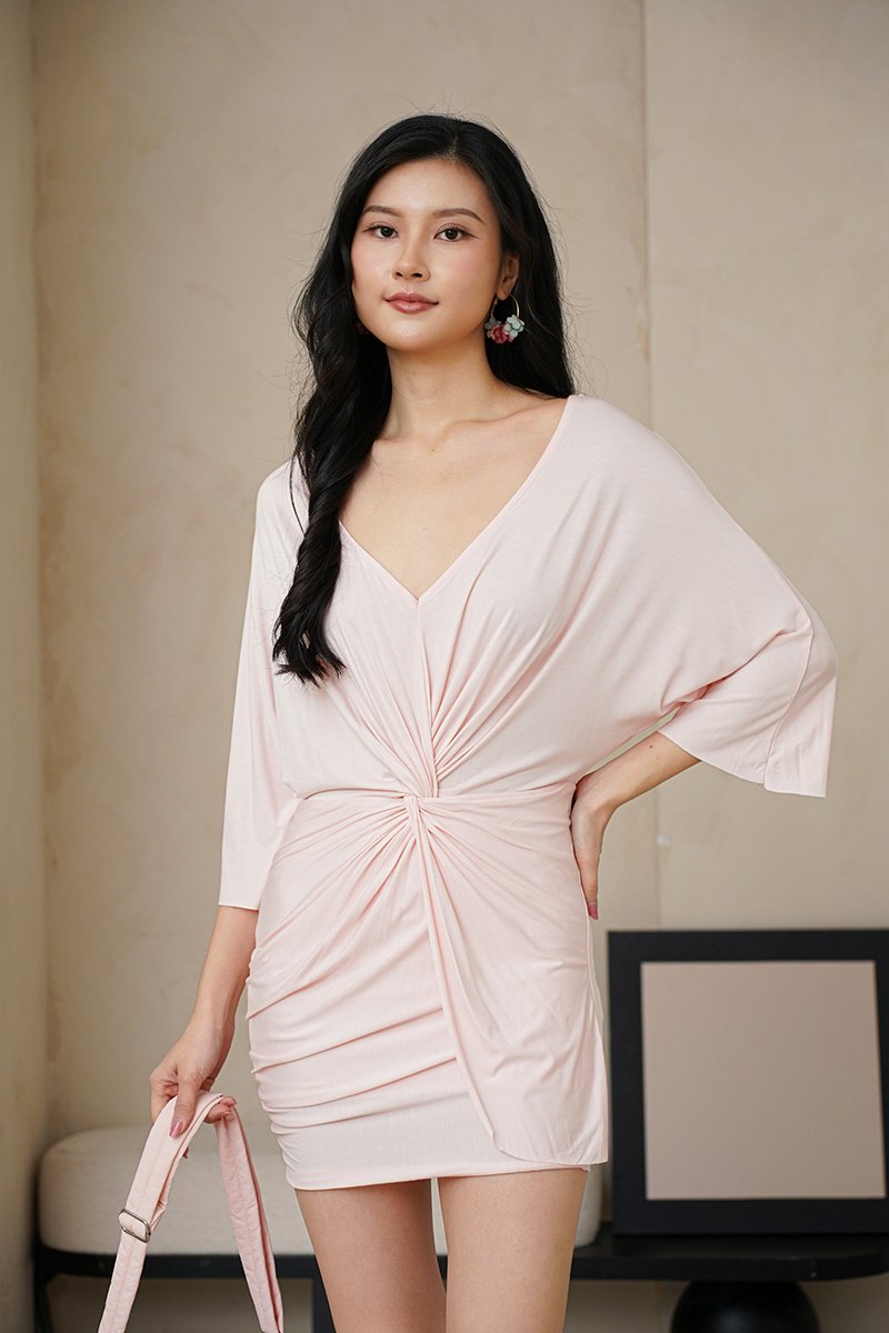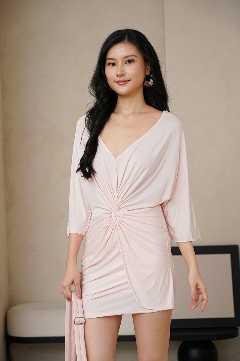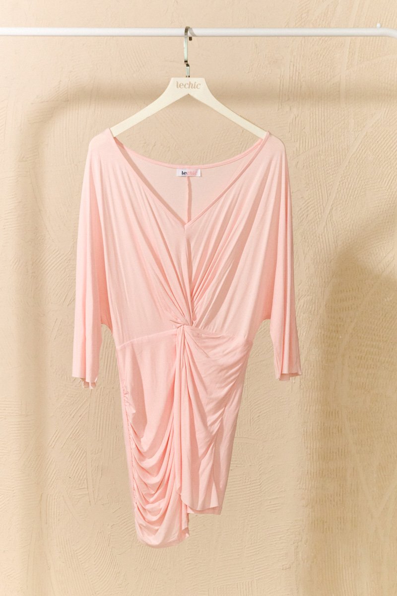 This jersey cotton dress features long bat sleeves and beautiful draping that meet in the knotted center of this figure-flattering silhouette. Twisted at the front in a statement knot, the Twists and Drapes Dress is here to enhance your curves. The intricate knot front detailing on the front waist level creates a focal point that accentuates your figure with tasteful elegance. The soft touch jersey feels amazing on your skin whilst the relaxed cut means that you can lounge around or get up to your usual business. A comfortable fit in a figure-flattering silhouette, a twisted knot at the waist adds shape to this effortless tee shirt dress. Your favourite tee shirt is now your favourite dress, this dress features a v neck, bat style sleeves, and an easy to wear, slouchy fit, in a easy to wear everyday length. A casual-luxe dress for the party circuit, this dress presents a roomy silhouette and the soft, well-draped blend of cotton jersey slub gets a beautiful boost from its wonderfully soft fabric. Straight, simple and semi-fitted, this shift tee dress effortlessly shifts from desk to dinner. Inner lined waist down, not sheer. Pull on styling. Made of stretchy jersey rayon cotton. Comes in grey, black and pink. Available in sizes S, M & L.