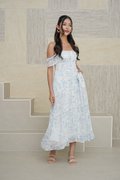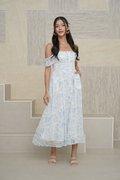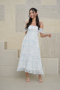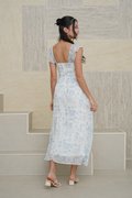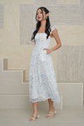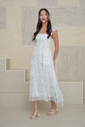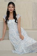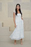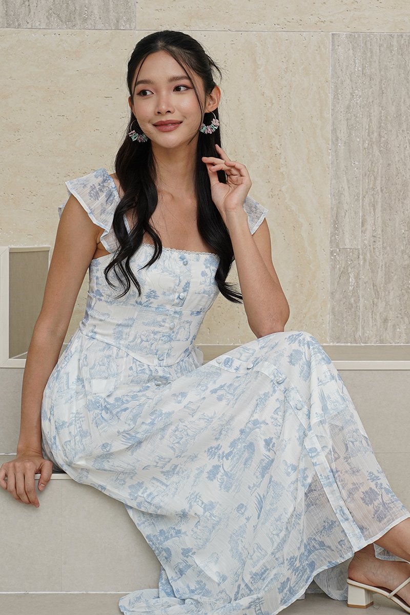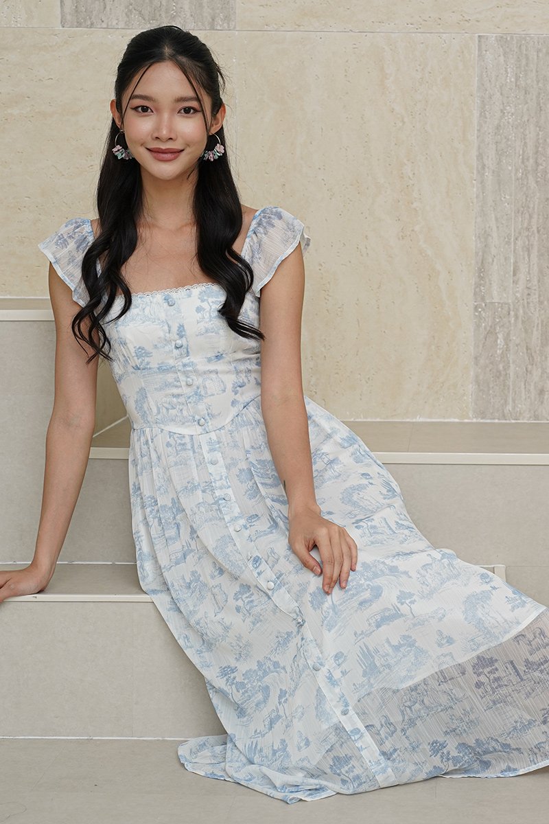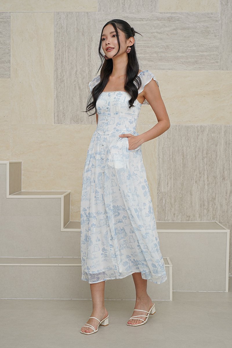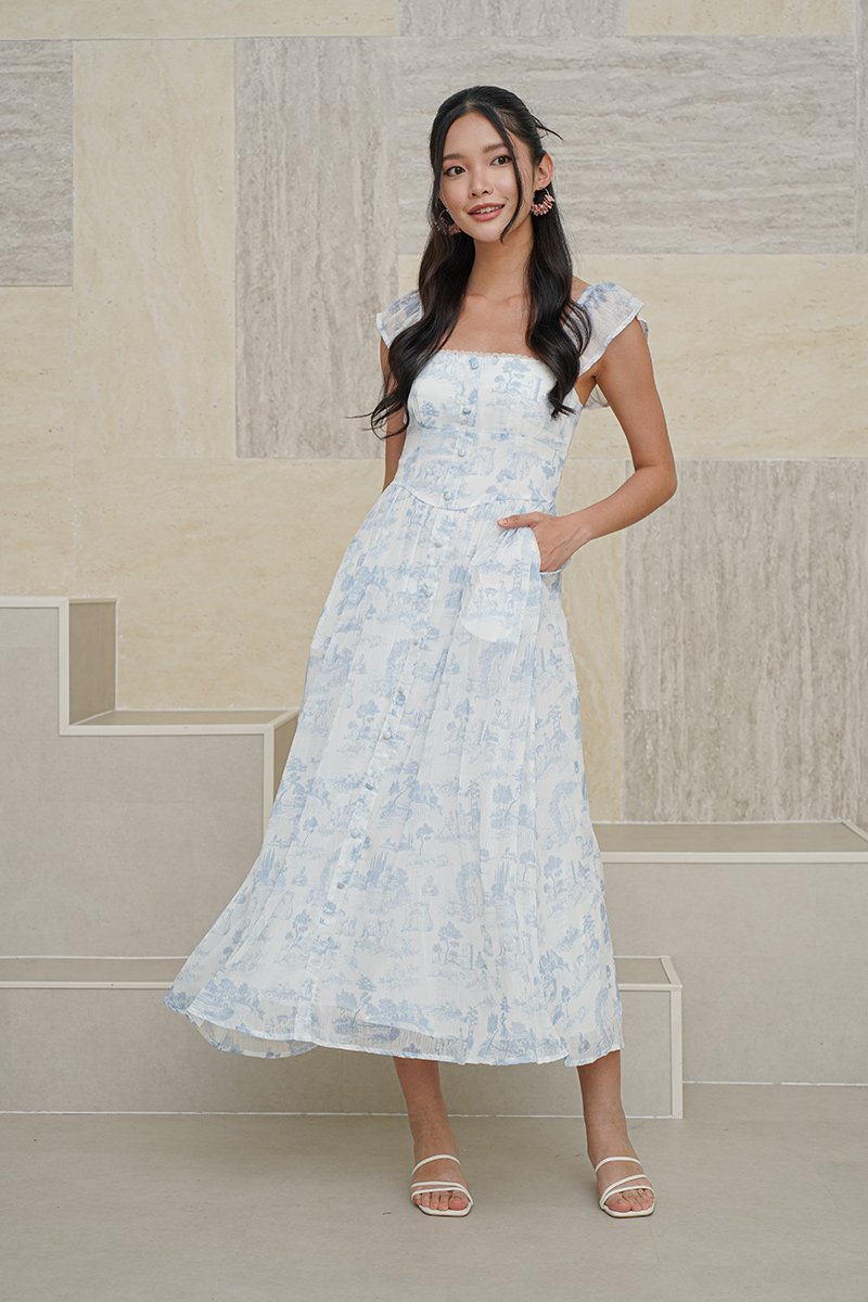 Wild Toile Padded Flutter Sleeve Midi Dress Blue
