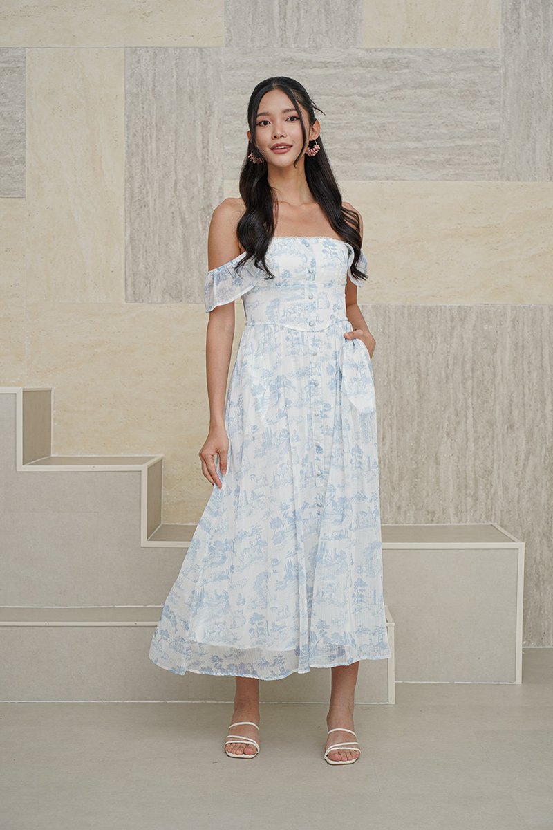 This latest toile number is serving up major spring romance! With its dreamy toile print, flutter straps, and delicate lace trim details, it’s the perfect pick for brunch or festive celebrations. Just add some dainty heels and a sunhat, and you’re all set for the sweetest spring moments! Channel your inner princess with the enchanting style of this midi dress, kissed with buttons down the front and finished with fluttery straps at the shoulders. This dress is basically Saturday in clothing form. Covered in a custom toile-inspired print featuring iconic landmarks and pastoral scenes, this spirit dress was made for our toile-loving fans who want to stand out—in the daintiest and softest way possible. The soft pastel pattern is full of personality, while the ruffle sleeves, lace trimmed neckline, and layered silhouette keep things sweet, flattering, and feminine. Bonus: it’s fully lined and made for twirling (whether it’s on the Plaza or at the tailgate). Be the source of romance in the room in a shoulder-showing dress designed with a smocked back and features a full buttondown. In cool, soft cotton with a wonderful, floral botanical print and a full low-calf sweep. Shaping princess seams. A dozen poly buttons down center front. Goes from casual to chic with no visible effort. Elasticised sleeves and neckline. Decorative buttons. Padded at bust. Comes with side pockets. Smocked at back. Fully lined, not sheer. Concealed back zip closure. Made of cotton polyester blend. Comes in blue and pink. Available in sizes S, M & L.