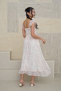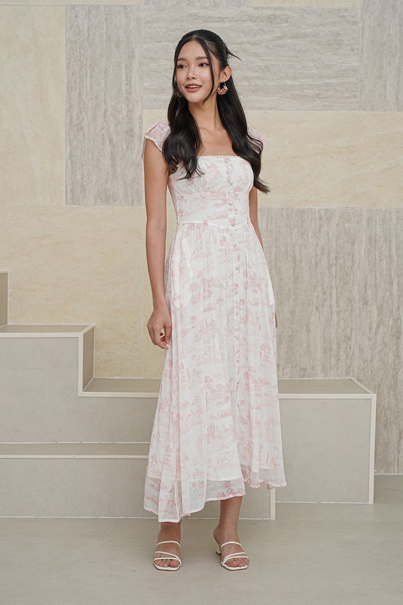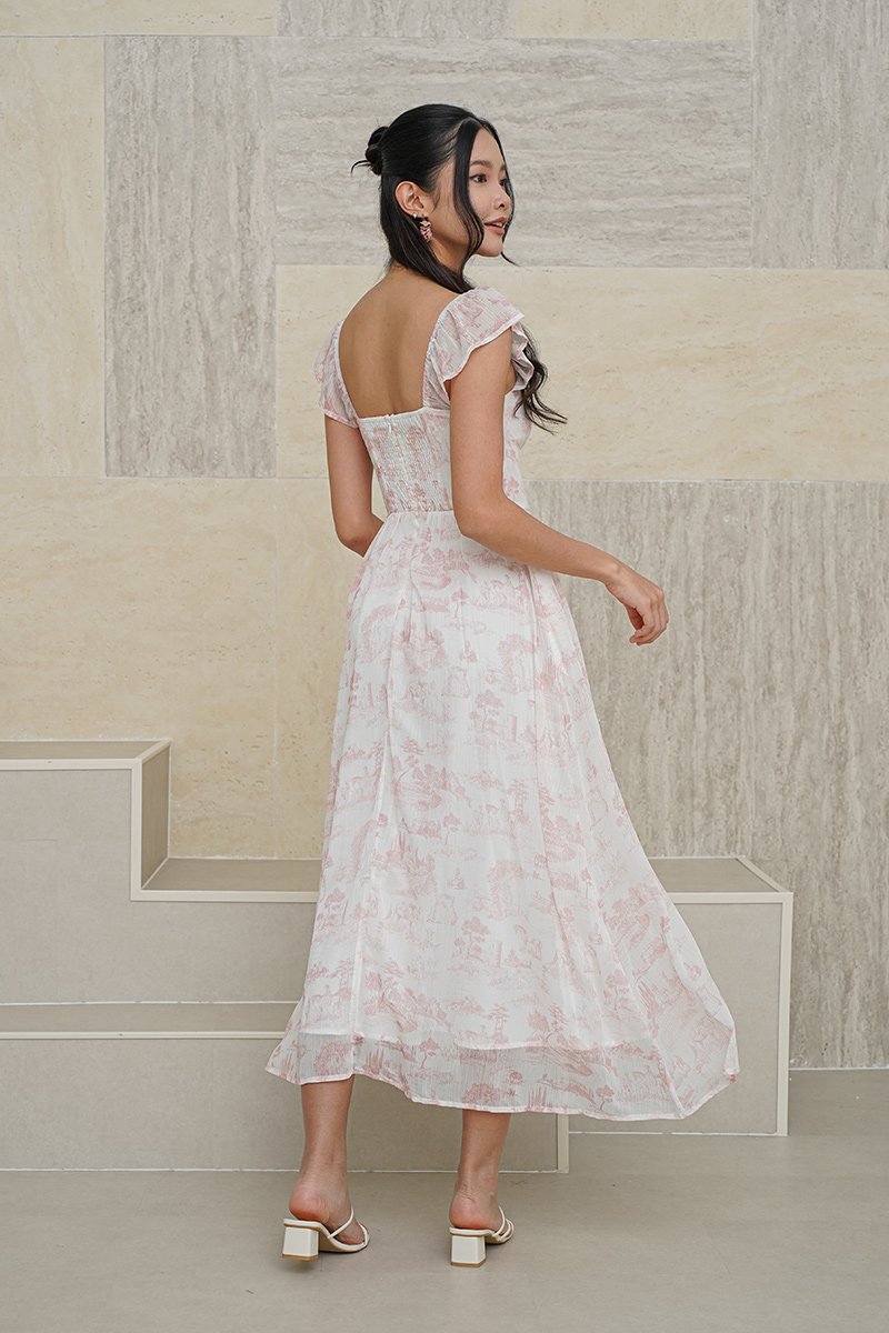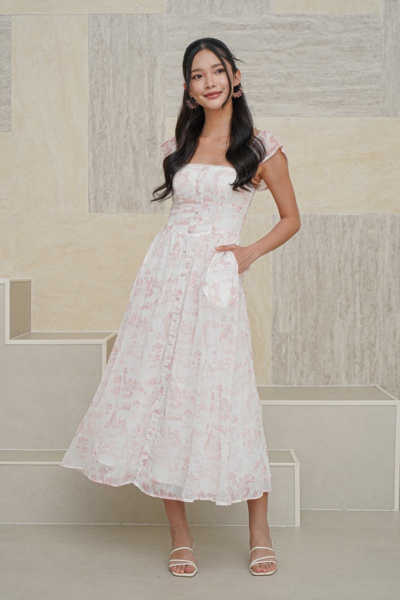 Wild Toile Padded Flutter Sleeve Midi Dress Pink